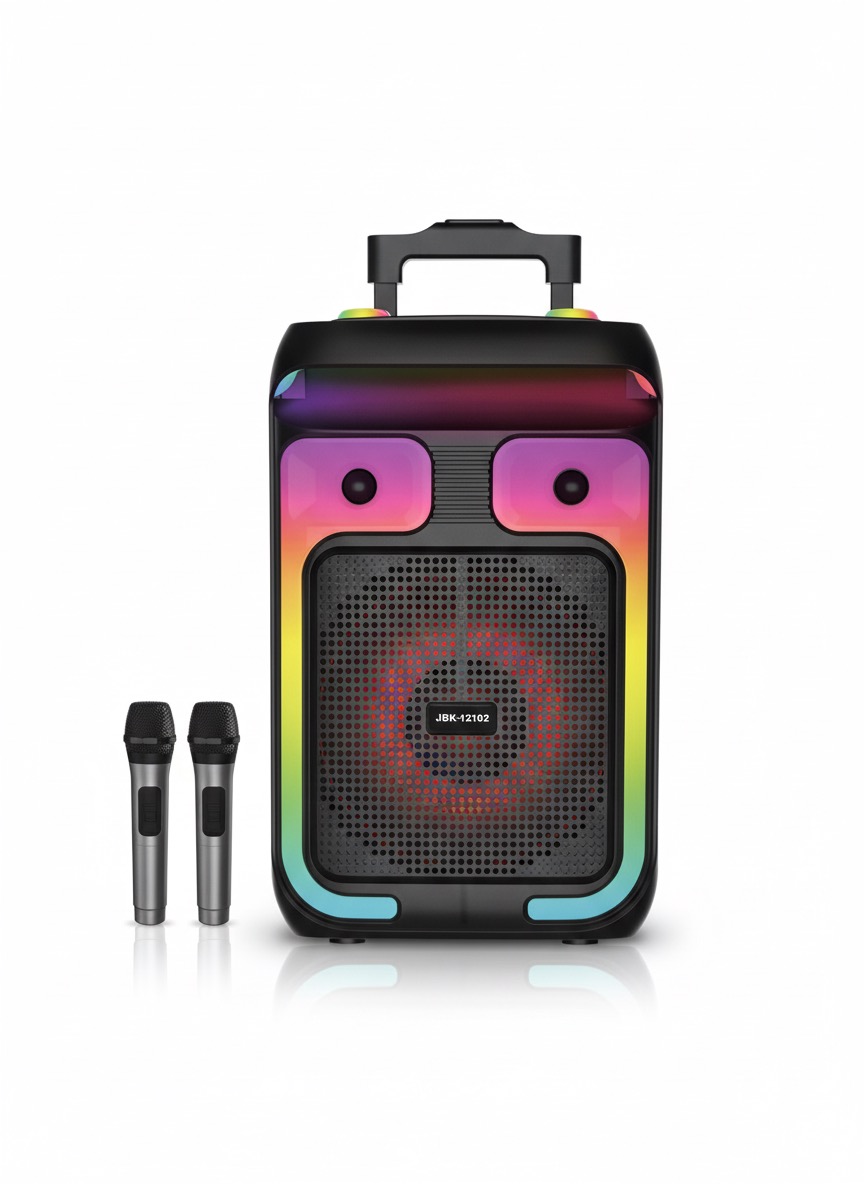 Jbk 12102 Portable Bluetooth Speaker With 2 Wireless Mic / 3000 mah Battery Capacity / Memory Card / Aux / USB / Volume Controller / Mic Volume Controller / Carry Handle / Carry Wheels / Led Light – Black