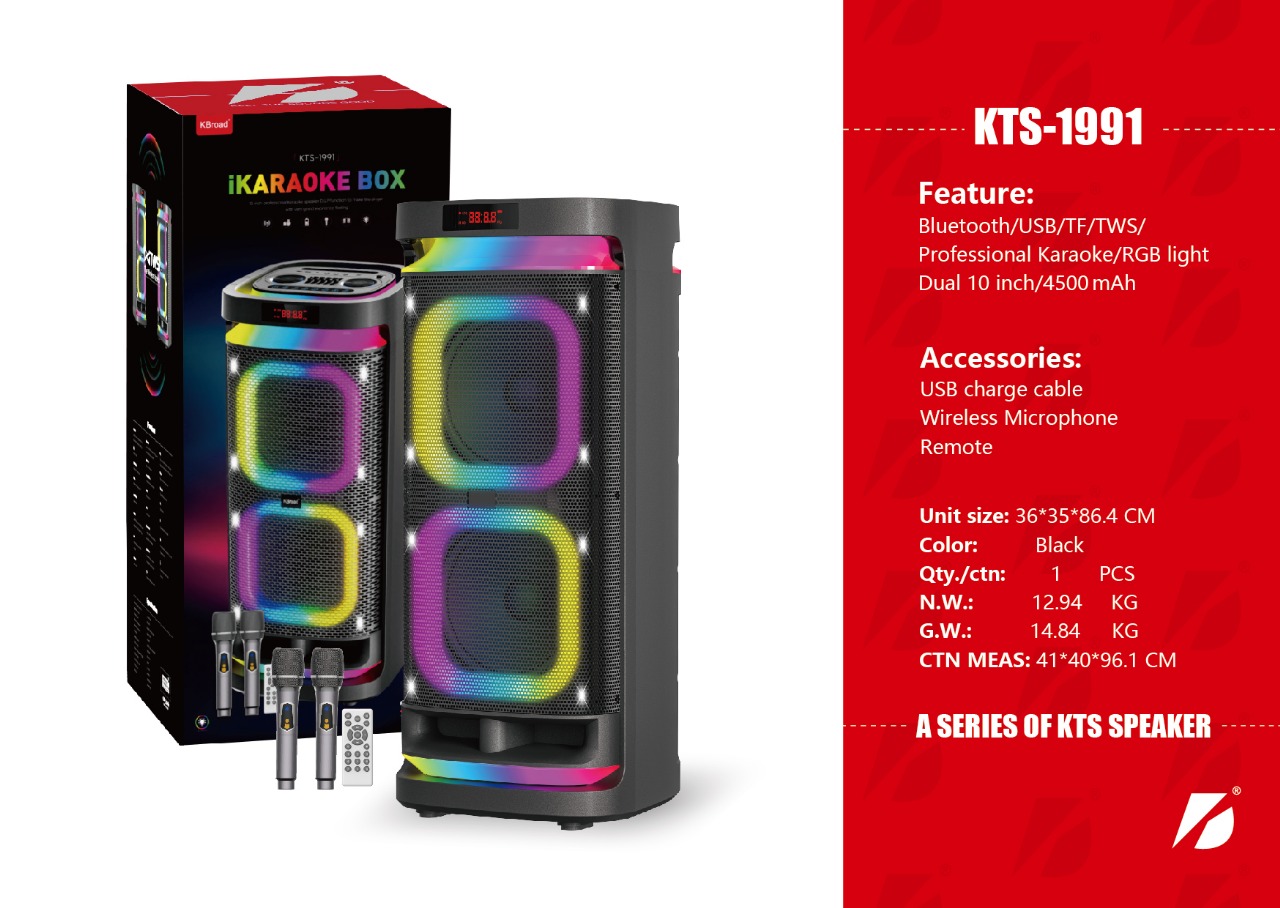 KBroad KTS – 1991, 10 Inch Professional Karaoke Speaker D.S.P Function And RGB LIght 2 Wireless Mic And Remote And Carry Wheel And Carry Handle – Black
